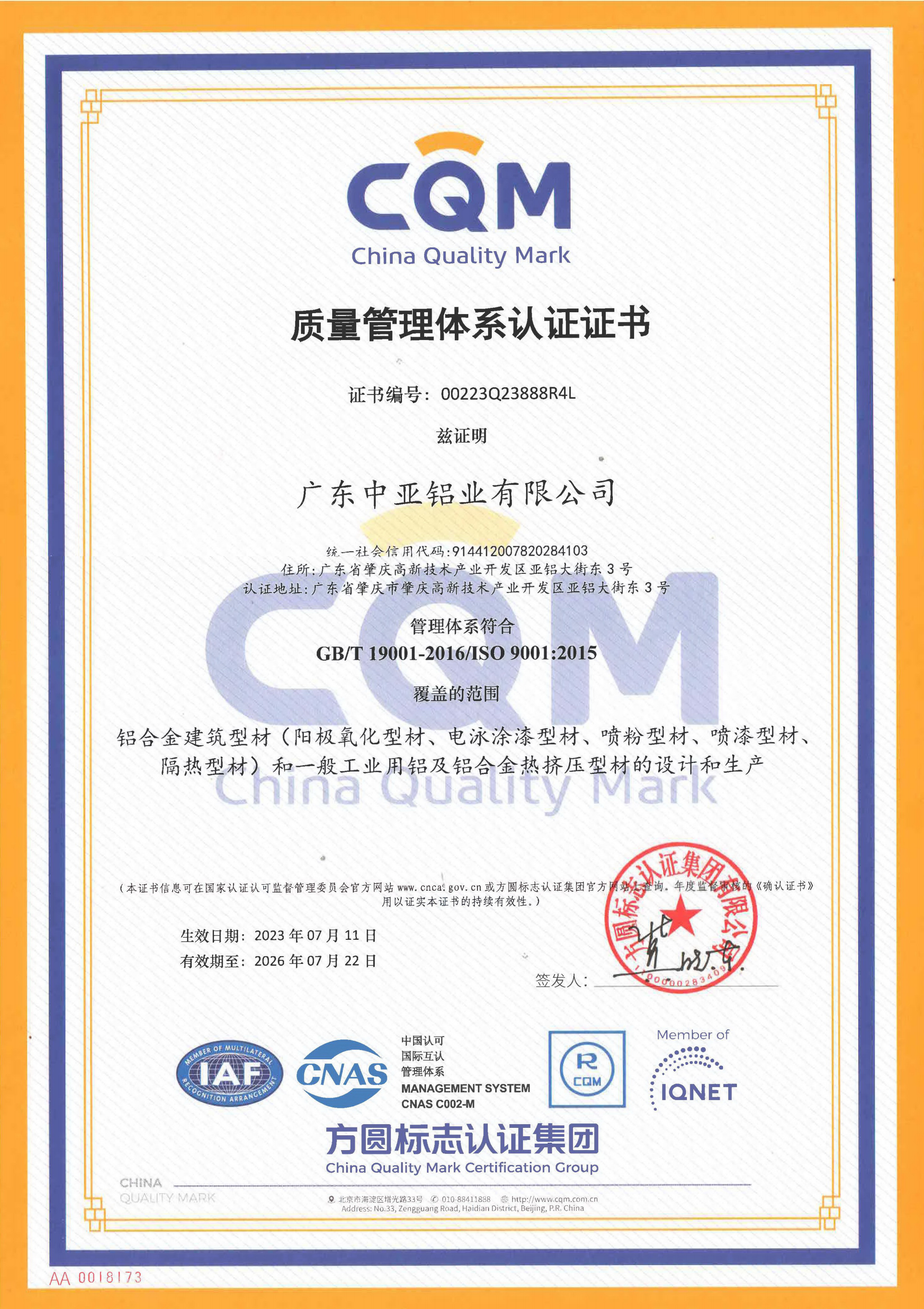 2023質(zhì)量管理體系認(rèn)證證書