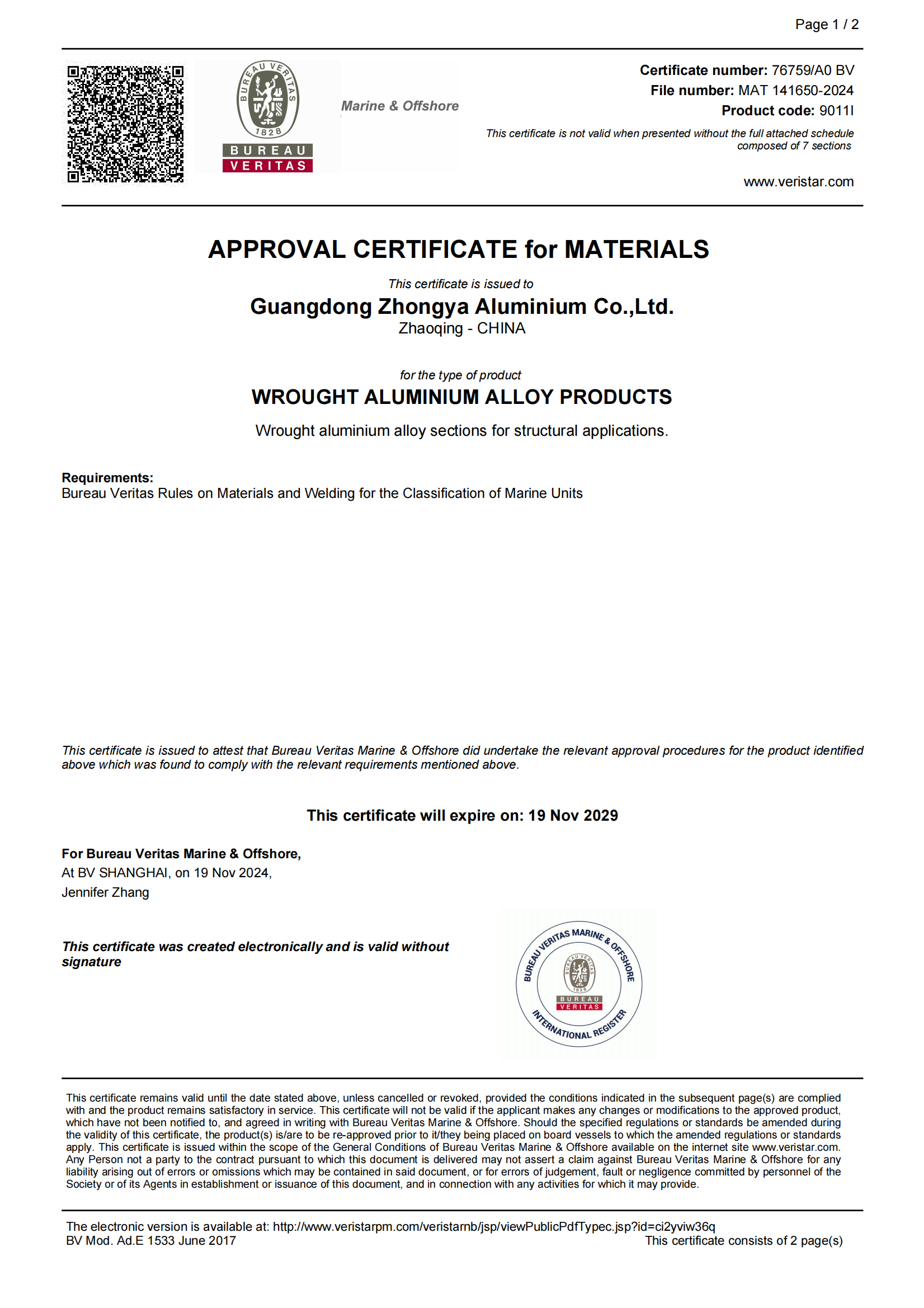 BV材料批準(zhǔn)證書 變形鋁2